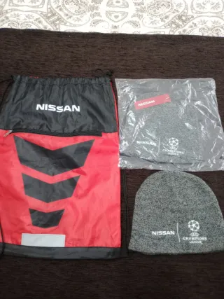 Lote de accesorios de Nissan. - Mochila deportiva. - Dos gorros de lana. - Diseño con logo de Champions League.
