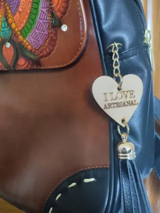 Bolso artesanal de cuero con un diseño único y detallado. - Elaborado en cuero de alta calidad. - Presenta un grabado central con figuras y motivos decorativos. - Bordes decorados con hilo de colores. - Cierre de botón a presión. - hay más artículos en mi perfil. - precio fijo no negociable gracias.