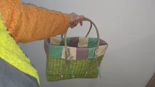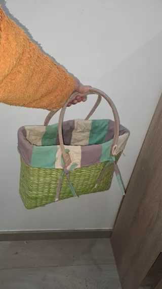 Bolso tipo cesta hecho de mimbre o ratan con un forro interior de tela a rayas. Verde. Esta como nuevo . Medidas : 35 x 25 x 10 cm