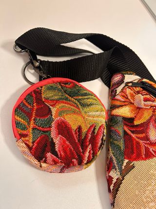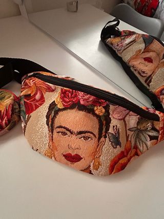 Riñonera con un diseño inspirado en Frida Kahlo. El estampado presenta detalles florales y el icónico rostro de la artista. Cierre de cremallera con bolsillo interior. Monedero pequeño para colgar Medidas aproximadas: • 35 cm de ancho • 16 cm de largo • 9 cm de ancho en la solapa