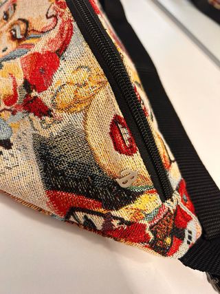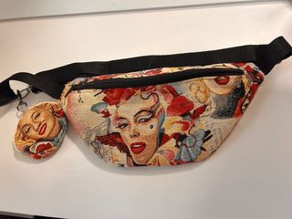 Riñonera con un diseño inspirado en Marilyn Monroe, acompañada de un llavero a juego. - Estampado de Marilyn Monroe y flores. - Cierre de cremallera. - Correa ajustable. Medidas aproximadas: • 35 cm de ancho • 16 cm de largo • 9 cm ancho solapa