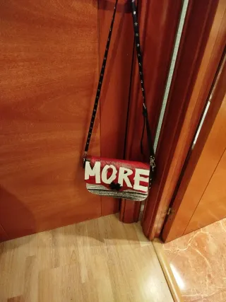 Bolso de mano con diseño llamativo y la palabra MORE en grande. - Combinación de colores vibrantes. - Correa ajustable con detalle de estrellas.
