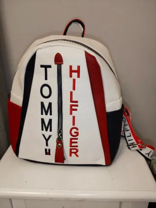 Mochila de la marca Tommy Hilfiger con un diseño moderno y llamativo. - Combinación de colores blanco, rojo y azul marino. - Detalle de cremallera frontal. - Logo de la marca bordado.