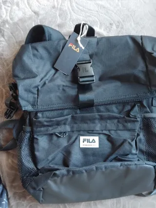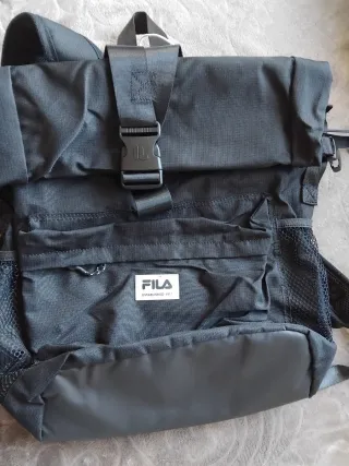 Mochila Fila en color negro, sin estrenar. - Cierre principal con hebilla. - Bolsillo frontal con cremallera. - Bolsillos laterales de malla. - Asa superior. - Correas ajustables.