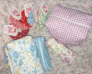 Conjunto de neceseres y coleteros con diseños alegres y coloridos. - Varios coleteros con diferentes estampados. - Neceser grande con estampado de cuadros vichy en lila. - Neceser mediano con estampado floral. - Neceser pequeño con estampado floral. - Neceser con estampado de cuadros vichy en azul.