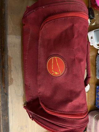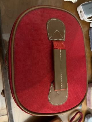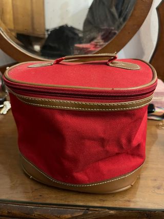 Neceser de tela en color rojo, con detalles y base en material que simula piel marrón. - Cierre de cremallera. - Asa superior para facilitar su transporte. - Diseño ovalado.