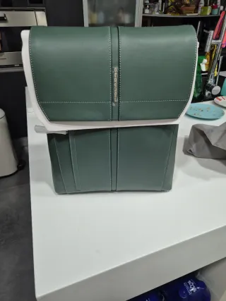 Conjunto de dos bolsos y una mochila para hombre. - Bolso negro de piel sintética con varios compartimentos. - Bolso negro con detalles naranjas y logo. - Mochila azul con bolsillo frontal. Los bolsos son negros y la mochila azul. están en perfecto estado a pesar del poco uso