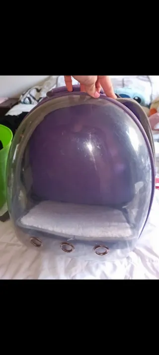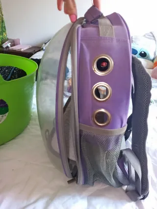 Mochila con diseño de burbuja para transportar mascotas. - Interior con cojín blanco. - Ventilación a través de ojales metálicos.