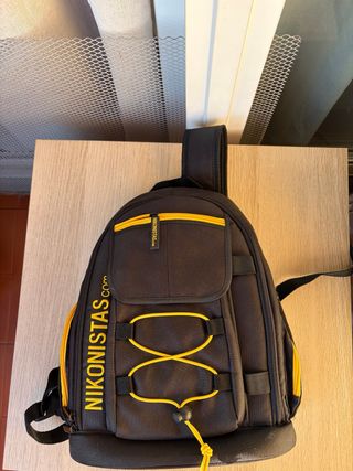 Mochila de la marca Nikonistas con un diseño moderno y funcional. - Color principal negro con detalles en amarillo. - Cierre de cremallera. - Bolsillo frontal con cordones elásticos.