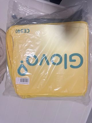 Mochila de reparto Glovo en colores gris y amarillo. Ideal para mensajeros. - Material resistente. - Cierre de cremallera. - Fabricada en China.