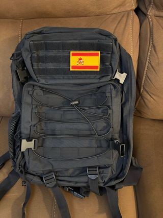 Mochila negra de estilo táctico, ideal para entrenamientos o uso diario. - Compartimento principal espacioso. - Múltiples correas MOLLE para personalización. - Bolsillo frontal con cierre de cremallera. - Panel de velcro para parches