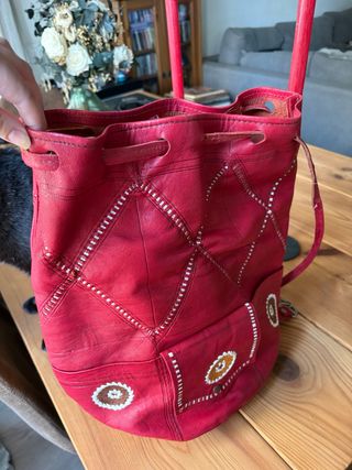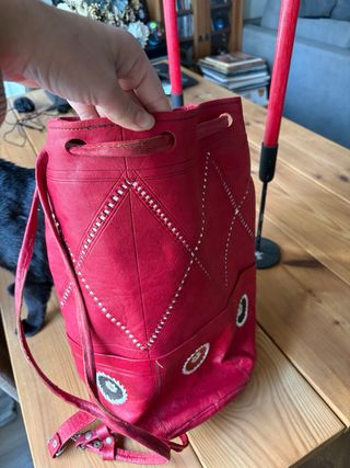 Mochila de piel con un diseño único y llamativo. - Material: Piel. - Color: Rojo. - Adornos: Detalles bordados en blanco y marrón. - Cierre: Cordón ajustable.
