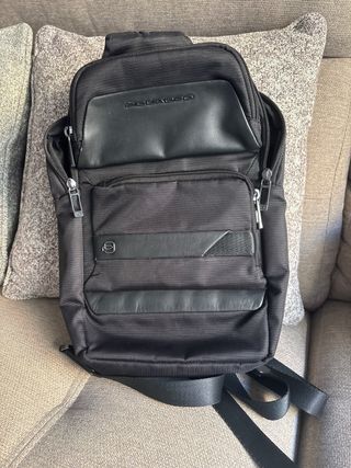 Mochila Piquadro de tamaño pequeño en color negro. - Compartimento principal con cierre. - Bolsillo frontal con cremallera. - Correa ajustable para el hombro. - Precio 180 euros Corte Inglés - Una Pasada un 2x1 Mochila/Bandoler