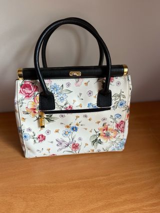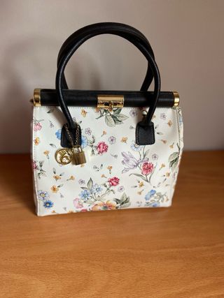 Elegante bolso Carla Ferreri con un bonito estampado floral. - Diseño llamativo y colorido. - Cierre de seguridad dorado. - Asa superior negra. - Incluye charm con candado.
