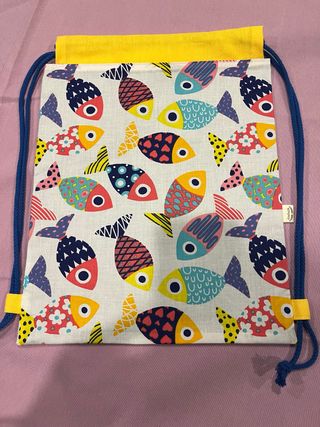 Mochila artesanal con un divertido estampado de peces. Confeccionada totalmente a mano con tejidos de calidad. - Cierre con cordones. - Diseño exclusivo - Forro y bolsillo interior.