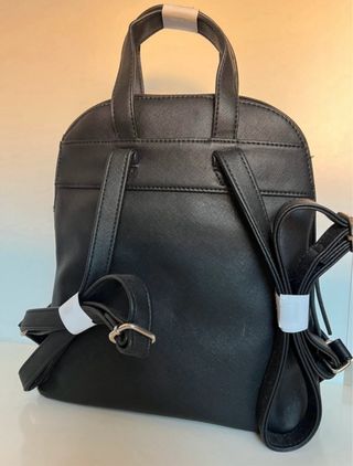 Mochila elegante y práctica de Nine West. - Diseño moderno con acabado texturizado. - Asa superior y correas ajustables. - Bolsillo frontal con detalle de tiras. - Compartimentos laterales. - Logo de la marca visible.
