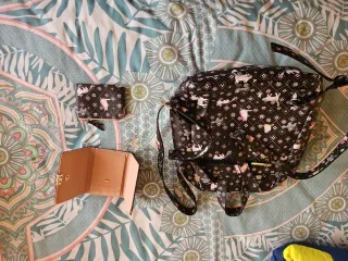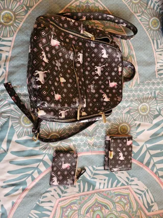 Conjunto de mochila, monedero y cartera con un divertido estampado. - Mochila con varios compartimentos y cremalleras. - Monedero a juego con cierre de cremallera. - Cartera con cierre de solapa y broche dorado.