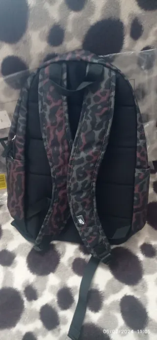 Mochila Nike con un diseño llamativo y moderno. - Estampado de leopardo en tonos burdeos y verde militar. - Compartimento principal espacioso. - Logo de Nike en la parte frontal.