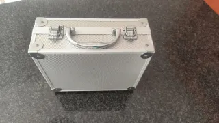 Maletín de aluminio con un diseño moderno y resistente. Ideal para transportar tus pertenencias con seguridad y estilo. - Material: Aluminio. - Acabado: Plateado. - Cierre: Doble pestillo. - Asa: Plegable y ergonómica. Medidas 25x 22 cm x 10cm alto