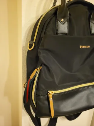 Versátil mochila Binnari que se puede usar también como bolso. - Diseño elegante en negro con detalles dorados. - Compartimento frontal con cremallera. - Asas superiores y correa ajustable para hombro.