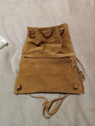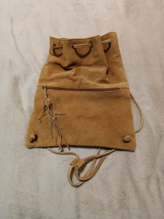 Mochila de ante con un diseño moderno y práctico. - Material: Ante - Cierre de cordón - Bolsillo exterior con cremallera - Adornos de flecos