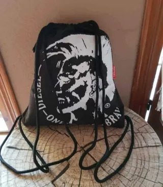 Mochila de la marca Diesel con un llamativo diseño. - Cierre de cordón. - Estampado frontal de un rostro. - Asa de hombro. - Etiqueta roja de la marca.