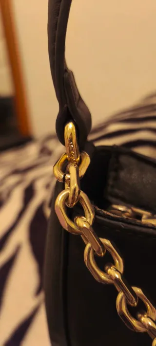 Elegante bolso de piel de borreguito en color negro con detalles dorados. - Diseño moderno y versátil. - Cadena dorada para llevar al hombro o cruzado.