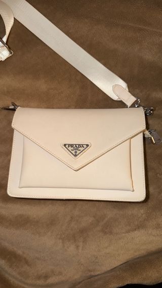 Elegante bolso de la marca Prada. - Diseño con solapa en forma de V. - Correa de tela ajustable. - Logo triangular de Prada en la parte frontal.