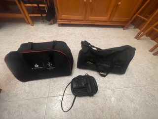 Conjunto de bolsas de viaje o deporte. - Una bolsa grande con detalles en rojo. - Otra bolsa grande con asas. - Un bolso pequeño con bolsillo frontal.
