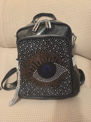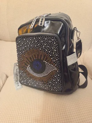 Mochila llamativa con un diseño único. - Acabado brillante. - Detalles de pedrería en forma de ojo. - Cremalleras gruesas plateadas.