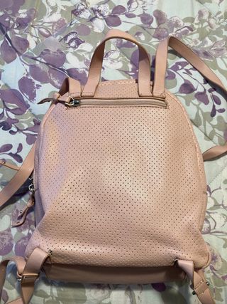 Mochila de color rosa con un diseño moderno y juvenil. Cuenta con un bolsillo frontal con cremallera y un detalle metálico. - Material con perforaciones. - Asa superior. - Correas ajustables. - Como se puede apreciar en la segunda foto un poco rota las asas de la parte de abajo de la mochila.