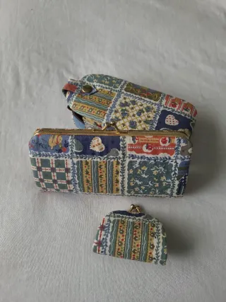 Conjunto de tres piezas con un diseño patchwork. - Funda para gafas. - Cartera. - Monedero.