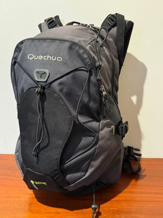 Mochila Quechua Arpenaz 20XC en tonos negro y gris. Perfecta para tus actividades al aire libre. - Cintas ajustables - Cierres con cremalleras y cordón elástico. - Portabastones - Cintura con riñonera acolchada - Diseño con múltiples compartimentos y bolsillos: - Compartimento principal con zona para bolsa de hidratación - Compartimento exterior con mini bolsillos portatodo - Bolsillo en la espalda con cremallera para documentación