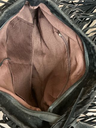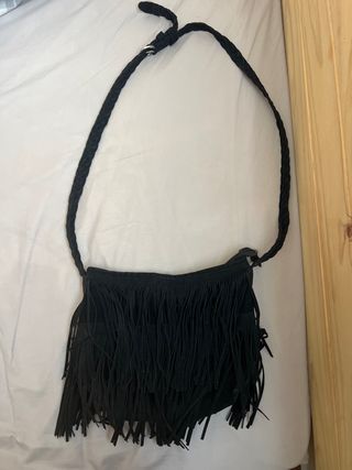 Bolso negro de estilo bohemio con flecos largos en ambos lados. Material: ante -Diseño con flecos en la parte delantera y trasera. - Correa trenzada ajustable. - Con cremallera en perfecto estado y en el interior tres muy útiles bolsillos.