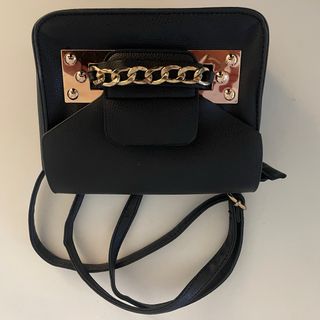 Bolso bandolera pequeño con un diseño moderno. - Material: Polipiel. - Color principal: Negro. - Detalles metálicos: Dorados.