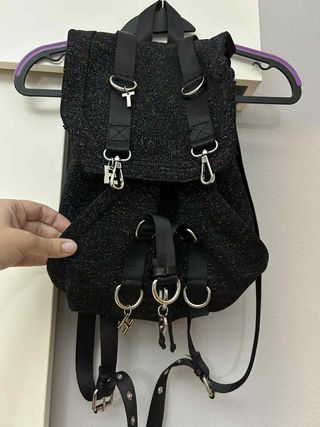 Preciosa mochila negra de Zara con detalles brillantes. Está prácticamente nueva. - Diseño único y llamativo. - Material brillante y elegante. - Perfecta para el día a día.
