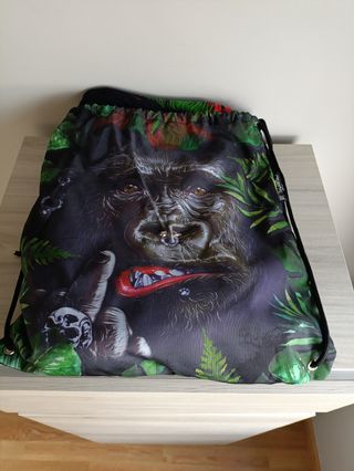 Práctica mochila con un llamativo diseño de gorila y detalles selváticos 42cm x 38cm y cierre de cuerdas de - Incluye una toalla 100% poliester 1m x 1,80m