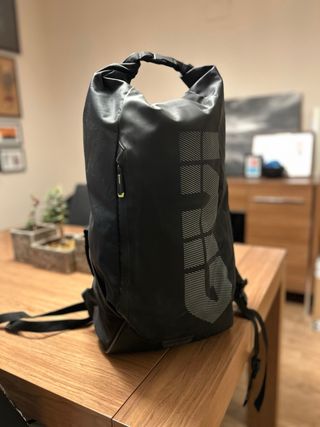 Mochila impermeable URBAN (tipo roll-top) Mochila negra con cierre enrollable (roll-top), totalmente impermeable, ideal para moto, bici, viajes o uso diario. Diseño moderno y minimalista con detalles reflectantes para mayor visibilidad. Cuenta con bolsillo lateral con cremallera estanca, asas acolchadas y respaldo cómodo. Muy resistente y ligera