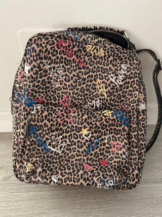 Mochila con estampado animal print y detalles de graffiti. - Diseño llamativo y moderno. - Compartimento principal espacioso. - Bolsillo frontal con cremallera.