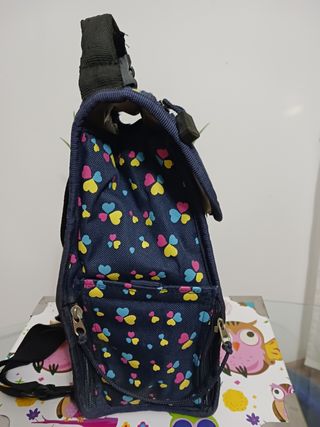Mochila tipo bandolera, tipo escolar. Medidas largo 37, alto 33, ancho 8cm.