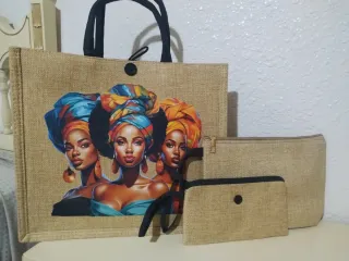 Conjunto de tres accesorios para dama con un diseño vibrante. - Bolso grande con estampado de tres mujeres. - Dos neceseres/monederos a juego. - Material tipo yute.