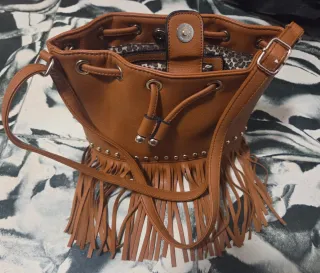 Bolso de estilo bandolera con flecos y tachuelas. - Cierre de cordón. - Forro interior con estampado de leopardo. - Correa ajustable.