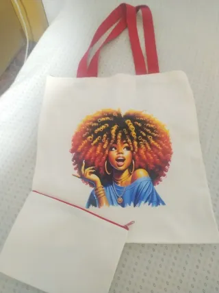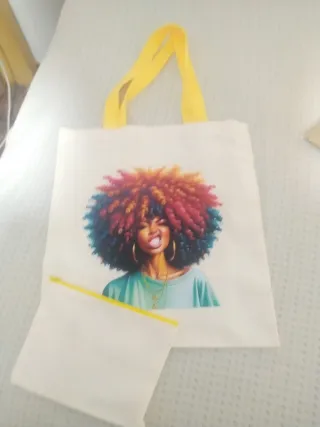 Conjunto de bolsa de playa y cartuchera a juego con un diseño vibrante. - Bolsa de tela con asas amarillas. - Cartuchera a juego con cremallera amarilla. - Estampado de una mujer con pelo afro multicolor.