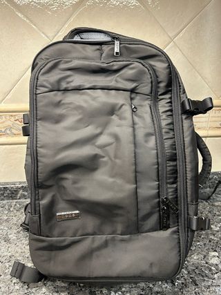 Mochila de viaje diseñada para cabina de avión. Tiene muy buena colocación y multitud de compartimentos. Tiene compartimento para PC acolchado, para botellin de agua en exterior etc. Tiene asas para llevar como una mochila o un asa superior para llevarla con la mano. Nueva sin usar.