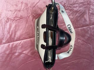 Bolso de hombro con un diseño elegante y moderno. El único desperfecto es la mancha de la correa pero supongo que podrá limpiarse. - Combinación de colores blanco y negro. - Correa de hombro ajustable. - Detalle de logo de la marca.