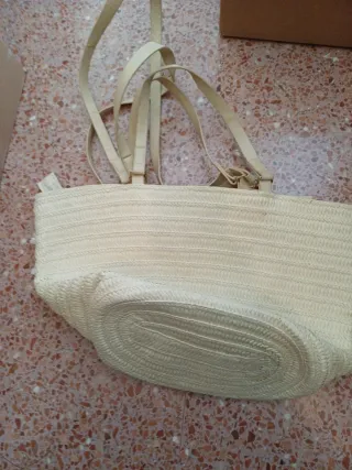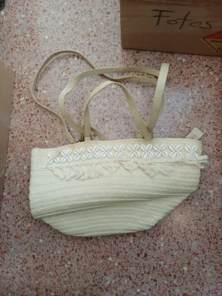 Bolso bandolera de la marca Misako. Es de color beige y tiene un diseño elegante y sencillo. - Medidas: 35 x 22 cm. - Asa larga para llevarlo al hombro o cruzado. - Cierre de cremallera. - Material: 50% algodón / 50% poliéster - En buen estado,solo una punta de la base un pelín pelada,nada importante.