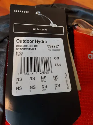 Mochila con hidratación Adidas Outdoor Hydra nueva a estrenar, sin usar, con etiquetas. Incluye bolsa para líquidos. Espalda ventilada y acolchada. Tiene una malla delantera de rápido acceso, un bolsillo delantero vertical, un compartimento principal y otro para bolsa de líquidos.