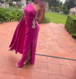 Precioso vestido de fiesta largo, color rosa fucsia. Es de un solo hombro y tiene detalles brillantes. Luce elegante y sofisticado. Tiene un solo uso. - Diseño de un hombro - Largo - Con abertura lateral - Detalles brillantes El vestido es de la tienda Modas Gilfanty en Avenida de Canarias, Vecindario. Precio: 180 €, conservo factura.