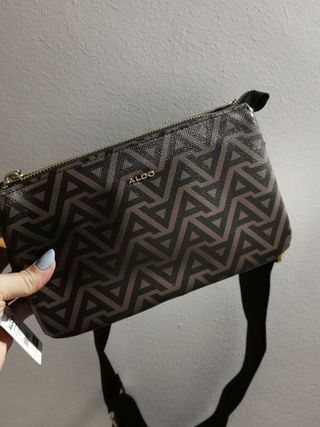 Precioso bolso bandolera de la marca Aldo. Es de color marrón y negro, con un diseño geométrico muy elegante. - Asa larga regulable para llevarlo al hombro o cruzado. - Cierre de cremallera. - Material: sintético de alta calidad.