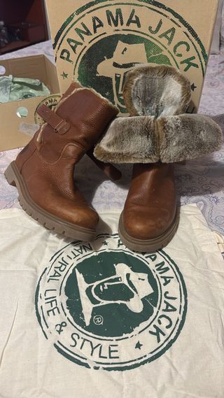 Botas de cuero Panama Jack en color marrón. Perfectas para el frío con su forro interior. - Cierre con correa. - Suela de goma antideslizante. - Detalle de pelo en el cuello de la bota. -modo Felia Un solo uso, en perfecto estado